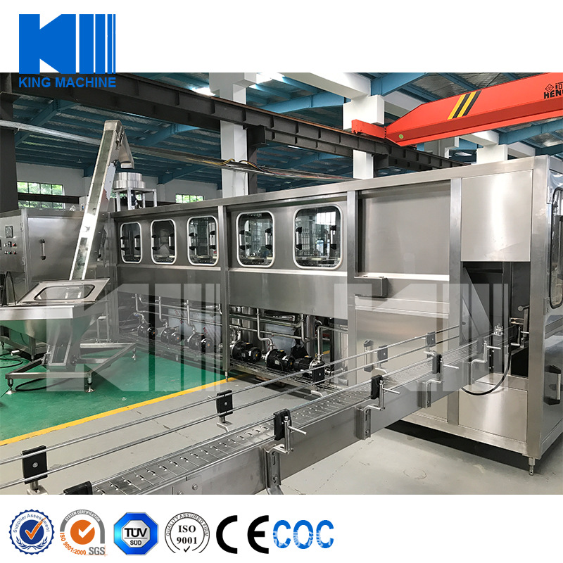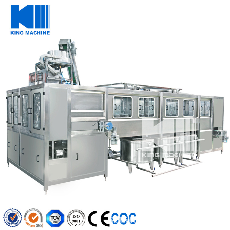 本灌裝生產線專用于3-5加侖桶裝水的灌裝,型號包括了QGF-100,QGF-240,QGF-300,QGF-450,QGF-600,QGF-900,QGF-1200。合消毒、沖洗、灌裝、壓蓋四為一體。沖洗機采用了多種洗液以及消毒液對瓶子進行清洗以及消毒,消毒液能夠循環(huán)使用。瓶蓋會在清洗和消毒后運至旋蓋機自動進行旋蓋。本產品功能齊全,涵蓋了清洗、消毒、灌裝、旋蓋、計數(shù)等功能,高度自動化,實為飲料生產廠家理想的設備。