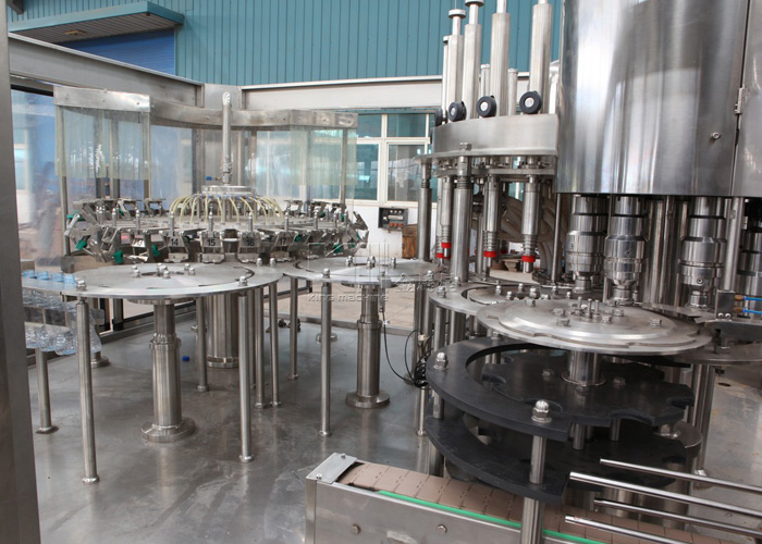 飲用水灌裝機集沖洗、灌裝、旋蓋于一體,全過程自動化運行,主要適用礦泉水、純凈水等不含氣飲料的沖瓶、灌裝、封口連續(xù)作業(yè)。本機大部分電器系統(tǒng)零件均采用國外較好產(chǎn)品,所有與液料接觸的地方均采用優(yōu)質(zhì)的不銹鋼材料制作,主關(guān)鍵部件采用數(shù)控機床精密加工, 整機光電檢測各部件的運行狀況,無瓶不灌裝,無瓶不送蓋,自動化程度高,操作簡易,具有耐磨、穩(wěn)定、故障率低等特點,產(chǎn)品質(zhì)量處于行業(yè)前列,是新老飲料投資者的理想選擇。